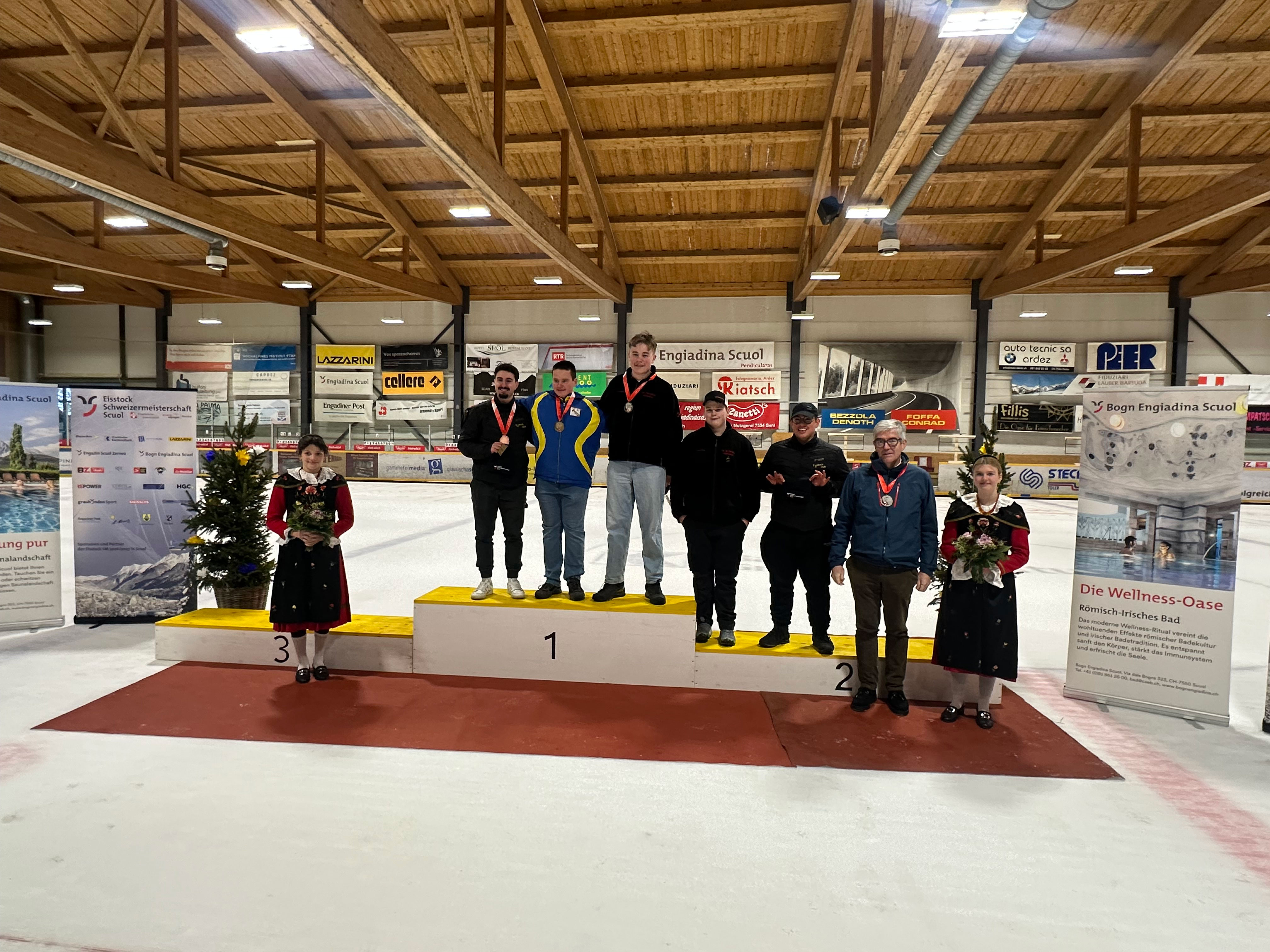 Im Mannschaftsspiel der Jugend/Junioren siegten Philipp Melcher und Francesco Pellegrino vom ESC St. Moritz, vor Zweisimmen-Rinderberg (Kilian Streun und Felix Giese) und dem EHC am Bachtel (Fabian Rüegg und Lenny Schicker)
